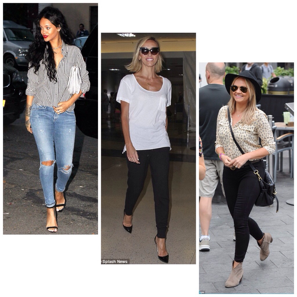 This is Rihanna’s take on a going out to a fancy dinner look. She’s THAT frickin’ cool! And I had to include my E! gurl Guiliana for working my fave monochrome into her comfy yet very chic airport outfit. Nicely done lovely! And I’m totally hearing on Emma’s print shirt combo with a bit of a boho twist (I’m so ripping this off) but I can’t help but think it looks a little warm for the hot weather we’ve had in Britain this week no?