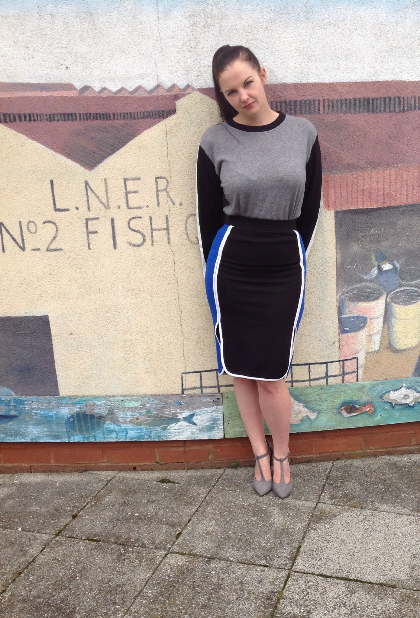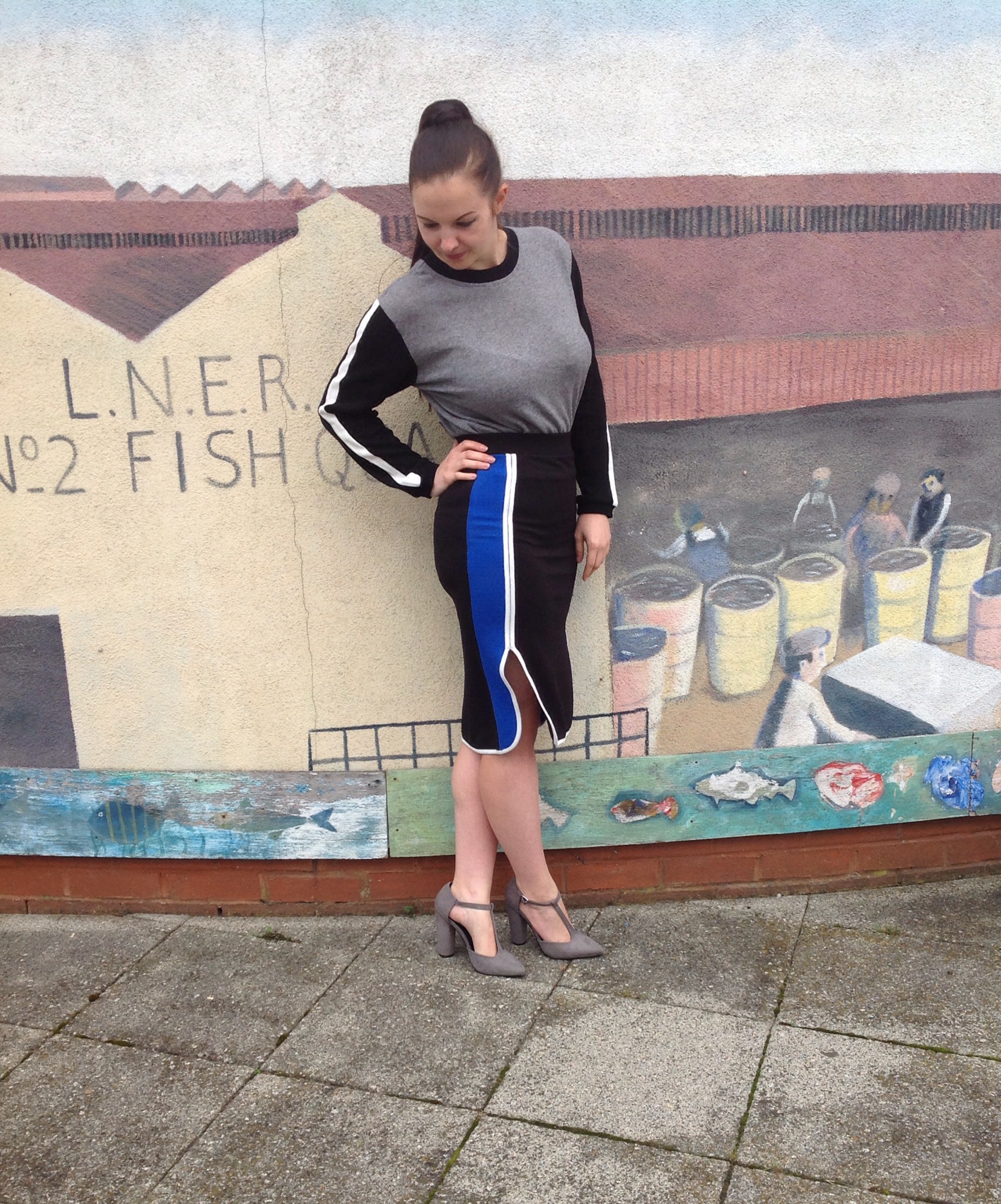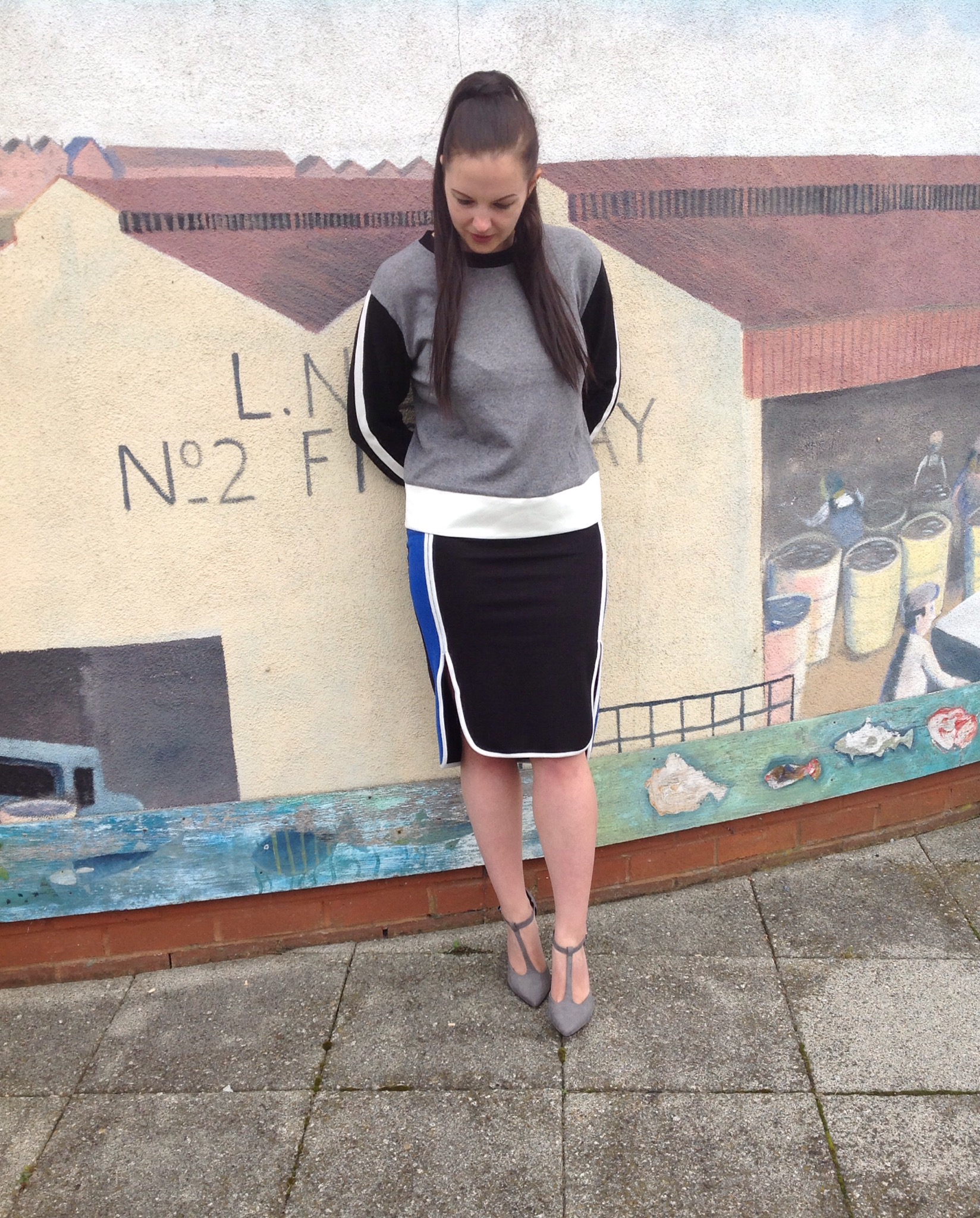 This is obviously a less casual take on the look that walks the line between funky and chic – the added bonus being that the stripes of the skirt act as illusion panels and draw the eye to the black area which creates a sleeker silhouette. I experimented with tucking in the jumper in and letting it hang out and to be honest I like both. Tucking in creates waist definition which shows off the smallest part of the traditional hourglass shape (or pear in my case) and leaving it out kind of skims over this and creates a different line with the White hem – however, I’d possibly approach the untucked option with caution when wearing a skirt as it could cause extra bulk on some figures and have the opposite effect. If in doubt, wear them separately. I wore the jumper with a pair of black skinnies and boots untucked and liked the look, and the skirt would work with so many other styles of top for a daytime or evening look. Since I was doing a sports luxe I thought I’d try channelling a bit of sporty hair a la Sporty Spice. She used to do these really sleek high ponytails when the Spice Girls did concerts so I thought that would look so fab with this outfit, as well as finally giving me a chance to try out my Hair Rehab London ponytail. When I left the house, it was indeed straight and sleek but the wind kind of put paid to that a little bit! And the shoes….oh, the shoes! I instantly liked them because they’re delicate with the t-bar and point at the front but very funky and practical with the block heel (and may I add, super comfy). They also come in the same cobalt as the skirt panel and a fabulous lime which I’m desperate for.
