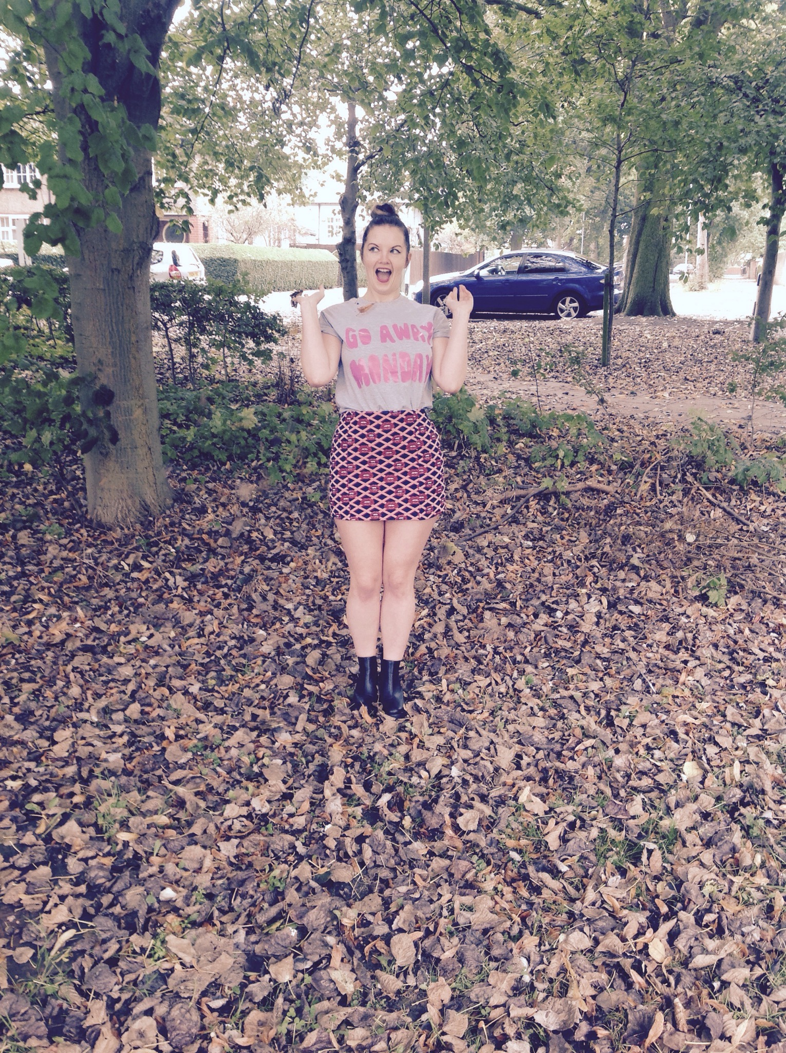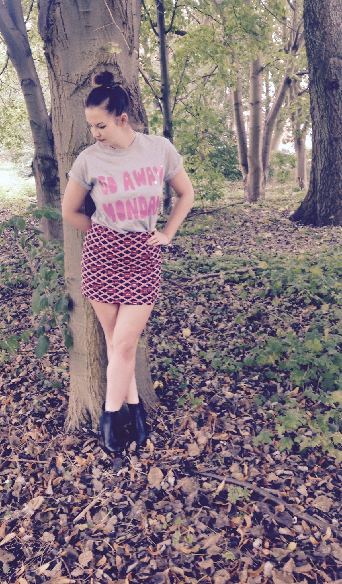 I’ve never been the type of girl who hates Mondays, they’ve never bothered me any more or less than other five days of the working week. But as I’m getting older I get more cynical about them, so when I saw this boyfriend tee I felt it needed to become part of my A/W wardrobe! The skirt is majorly pushing my comfort boundaries – it’s a pelmet style so very short and very straight which I wouldn’t EVER usually consider, but I’m a sucker for a cute print so thought I’d give it a go.