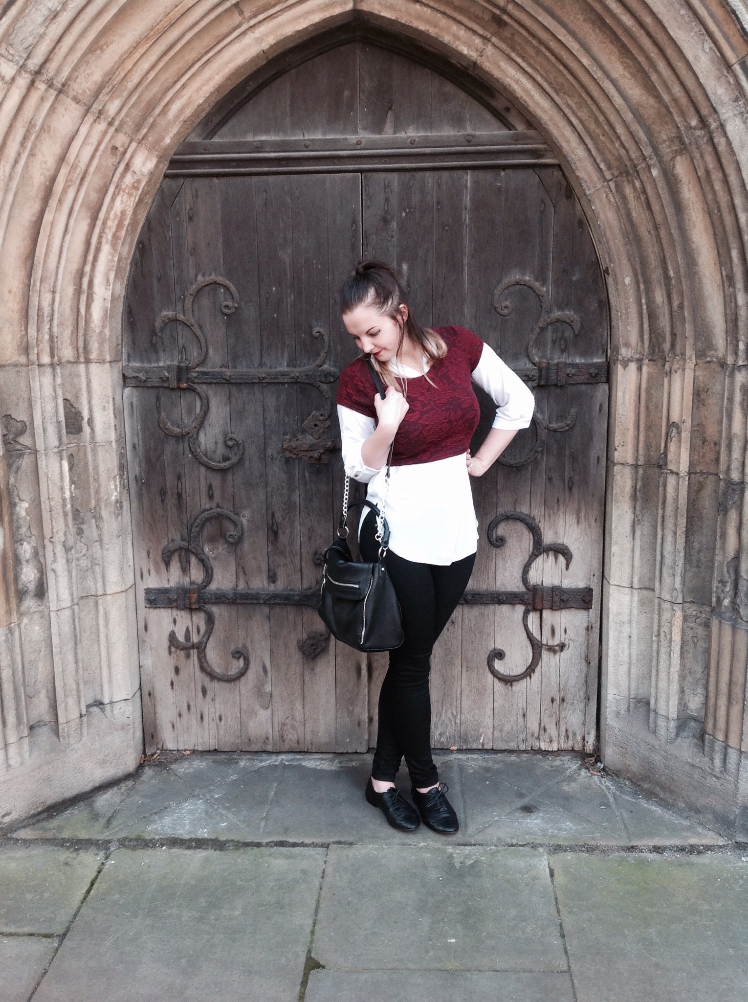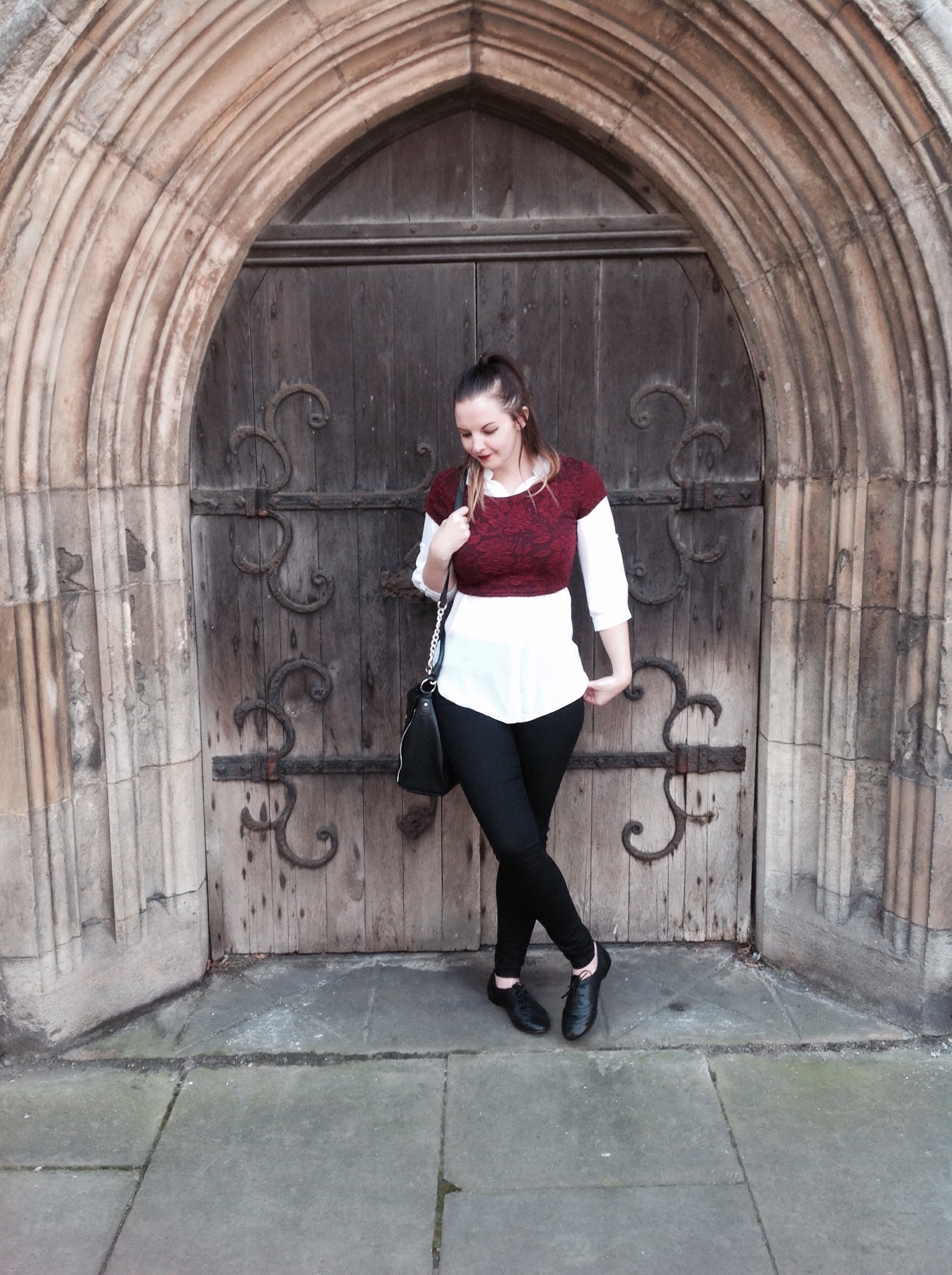 I like this look, but when I try it again I think a fitted shirt is going to work better to create more more waist definition – this one is more of a relaxed boyfriend fit so isn’t really meant to be tamed by something trying to pull it in! You can’t see in these pics but the crop is embossed with a a baroque print which adds another really cool textured element. I toyed with wearing leopard print slippers to add some quirk but decided that I’d keep the colour palette a bit more ‘clean’ and let the focal point be the crop top, so I took the chance to bring out my new brogues and I think this was a cooler choice in the end.