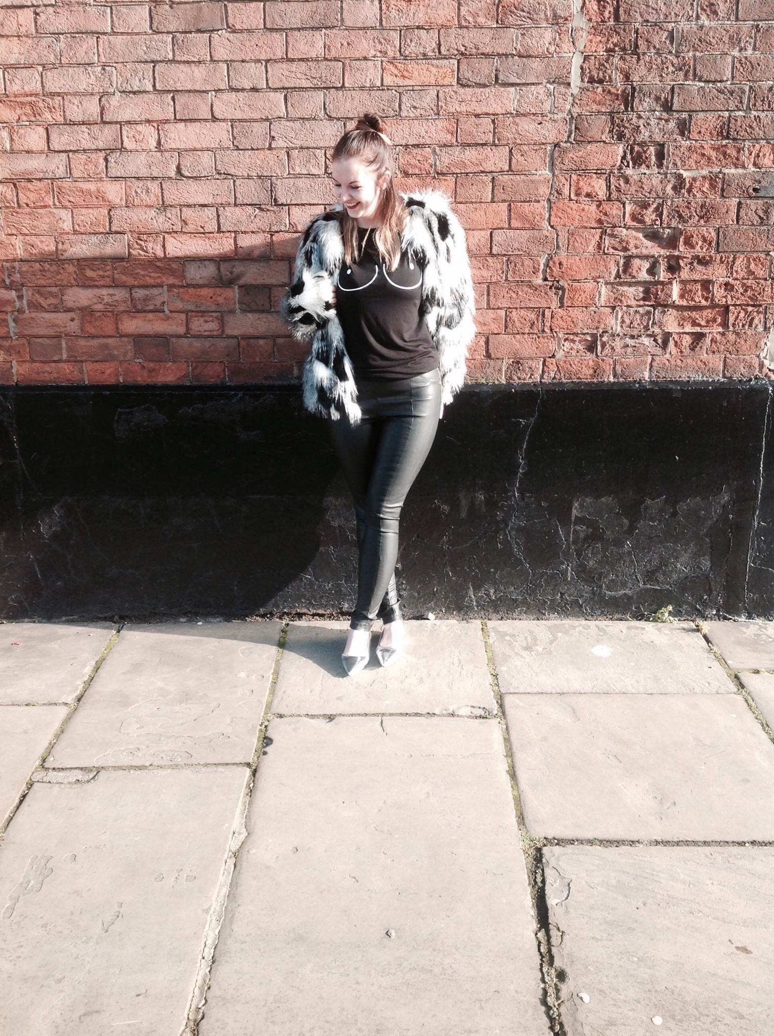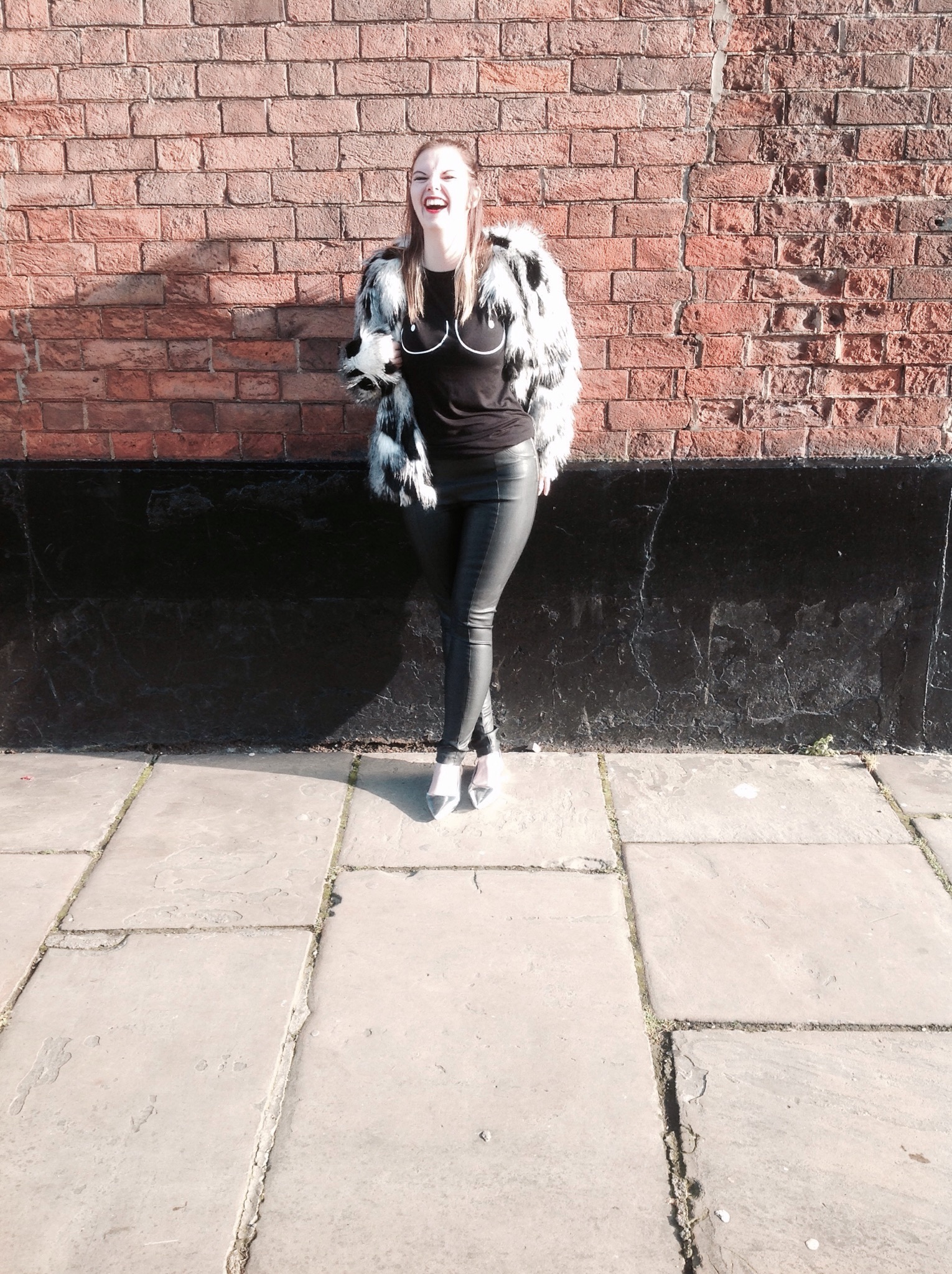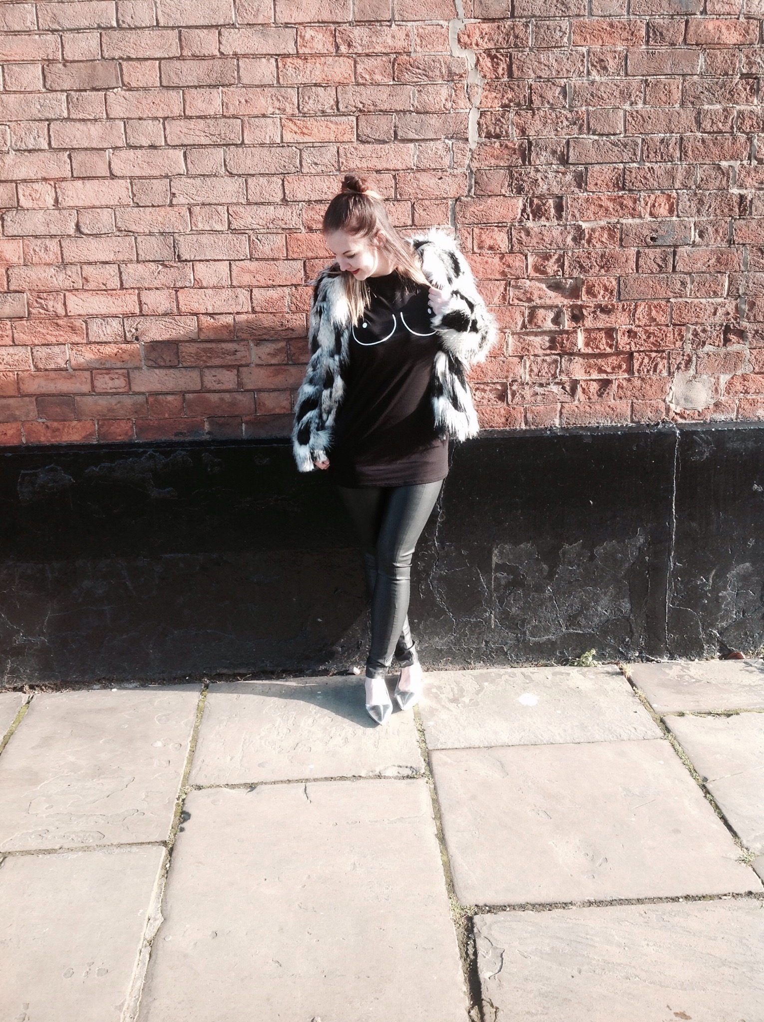 Also, how gorgeous are these shoes? Some of the best flats I’ve ever seen – shiny and pointy and so frickin’ cool even when you’re being casual. Little tip re the pleather treggings – you need the hoik (technical term, haha) them up gently yet firmly! Well worth it though as they’re really comfy and look a bit more glam than normal trousers for a change (my next look with them will be with knitwear a la Kendal Jenner in last week’s Style round up). My tee is one of my other purchases from Charlotte Crosby’s Nostalgia range with In The Style- cheeky and to the point, so very me! Not sure if I’ll be wearing this one to uni though…