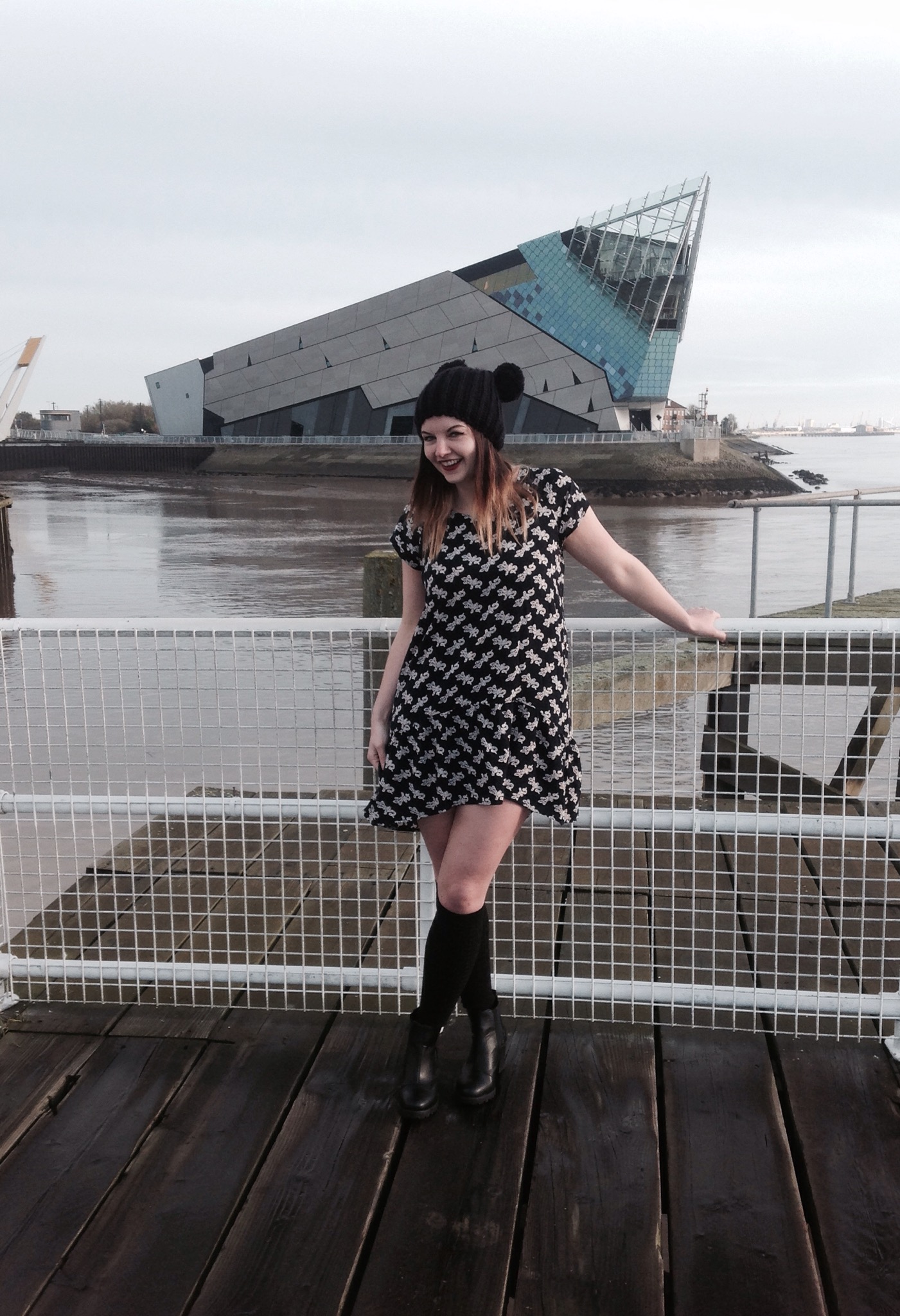 Anyway moving on from the City pride and back to the clothes…I’d just eaten a MAHOOSIVE and very delicious lunch, and felt completely comfy in this cute lil frock during and afterwards. The lizard design makes it bit more quirky and interesting, and honestly I’ve worn it so much lately that I’m sure Mr Alice thinks it’s the only one I have! I kept the lower half fitted with the dress being looser and brought the knee socks back out to keep the cute/quirky thang going, my go to cleated ankle boots and double bobble hat. Awesome! I also had on a black faux fur jacket (last season Dorothy Perkins) but took it off for the photos so you could see the dress better, possibly not the best thing to do when by the river on a chilly autumn day but it’s all in the name of blogging…well, Curious Alice.