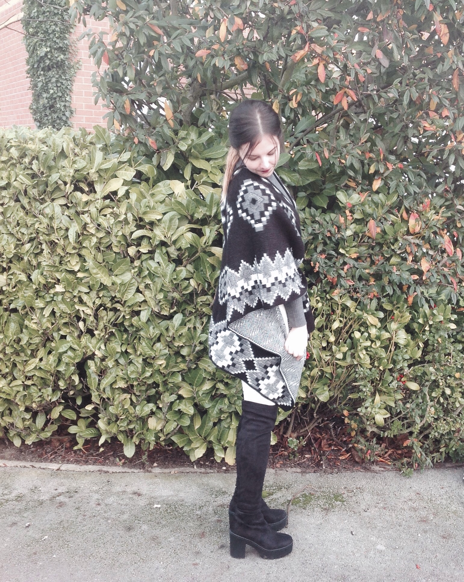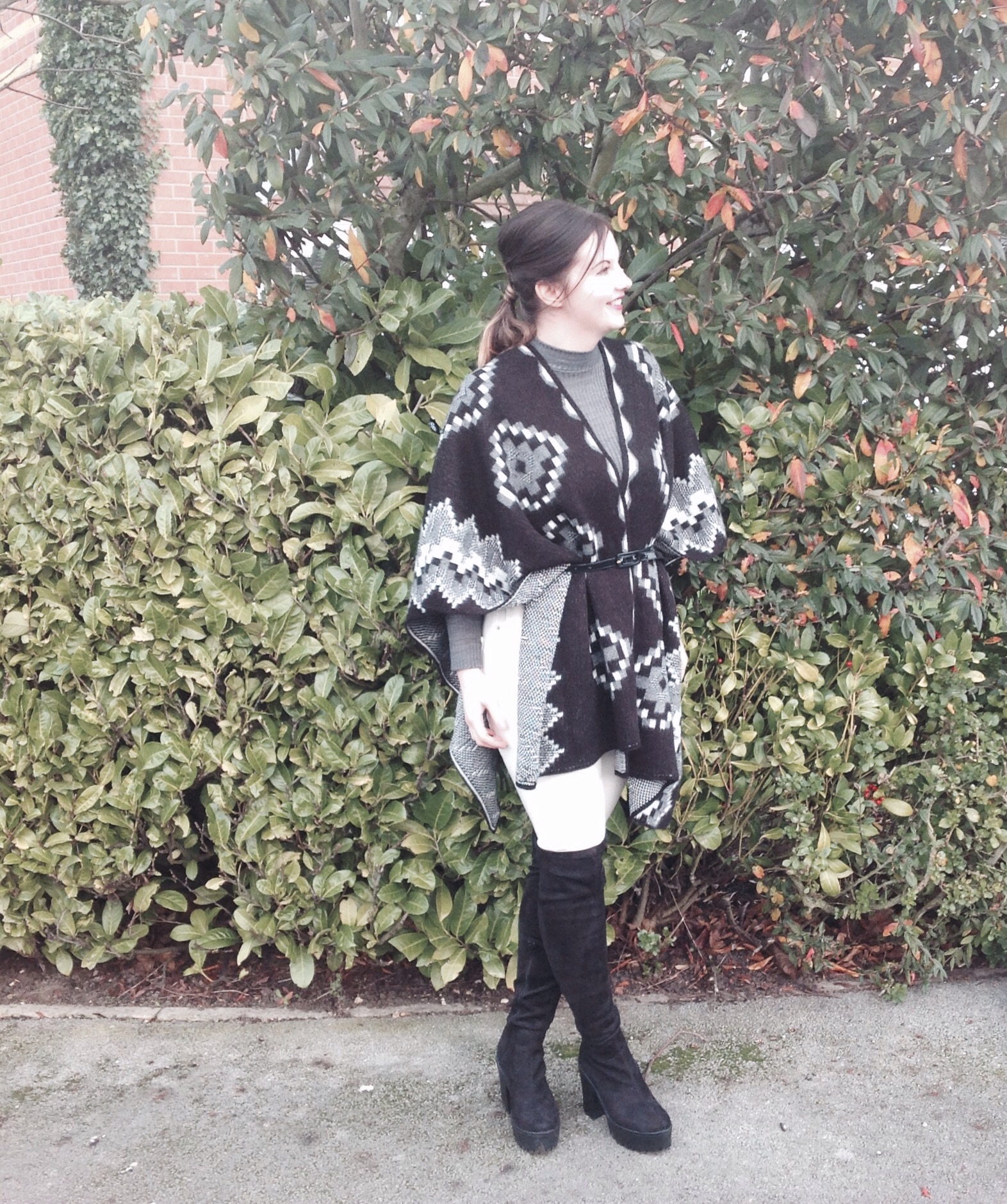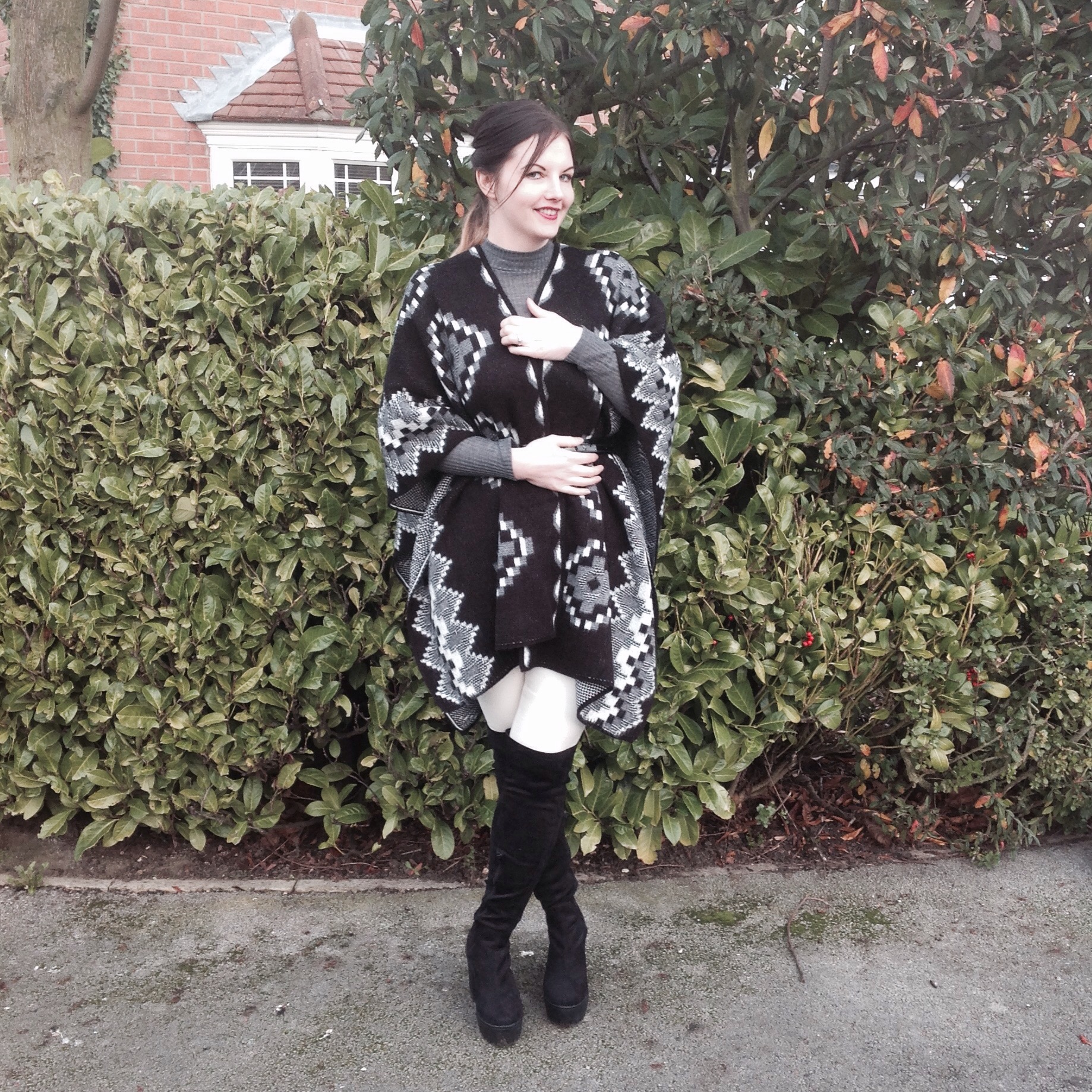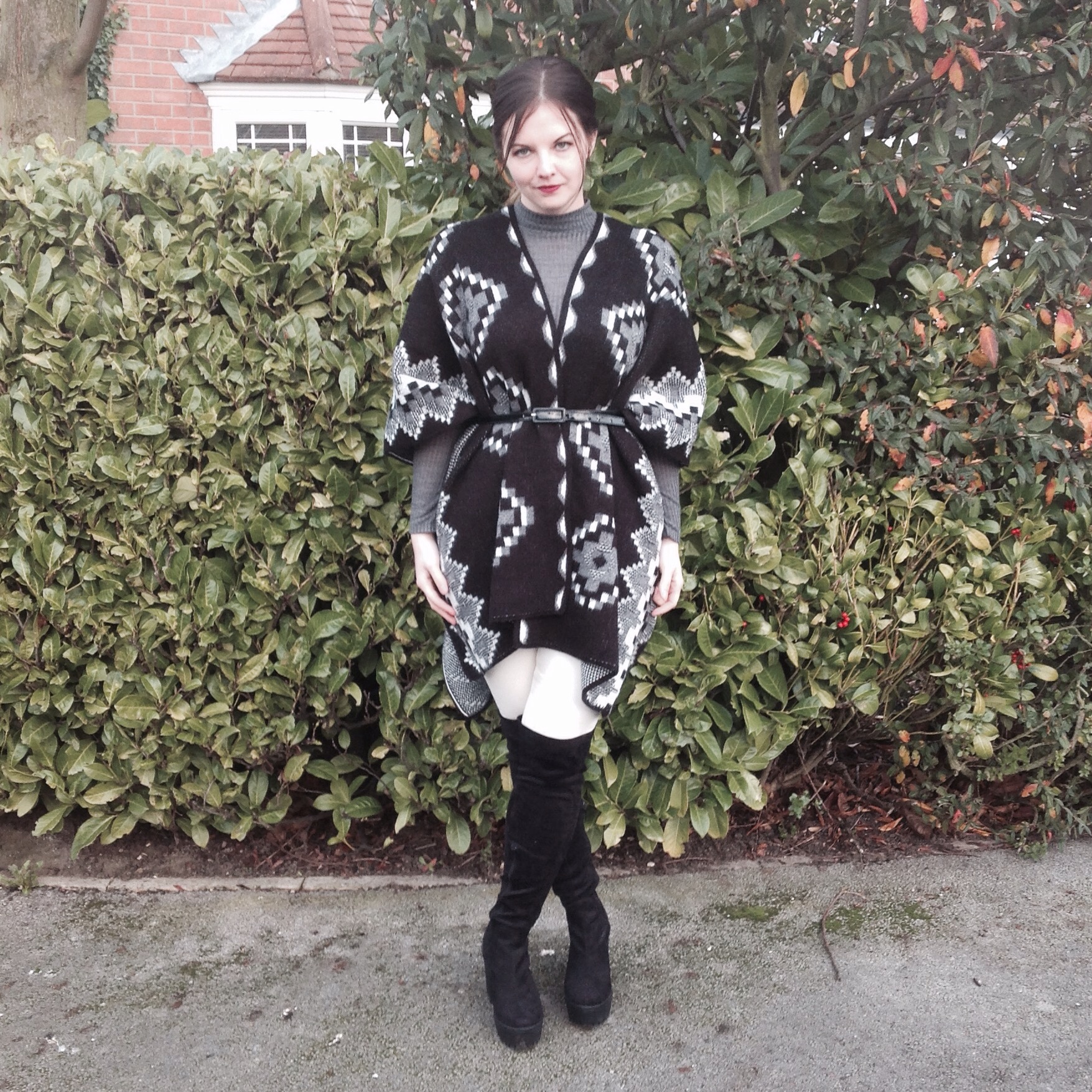 I felt like this was a sensible yet stylish outfit, brownie points to me! Haha. The long sleeved funnel neck kept me warm as did my gorgeous Aztec blanket cape, I belted it in the middle just to add a bit of shape and keep it chic rather than too casual. Hope it looks how I intended! I also tried my hand at the Cheryl beehive ponytail, up close I thought it looked really lovely with the overall look but the up close photos didn’t work out as well. Ah well.