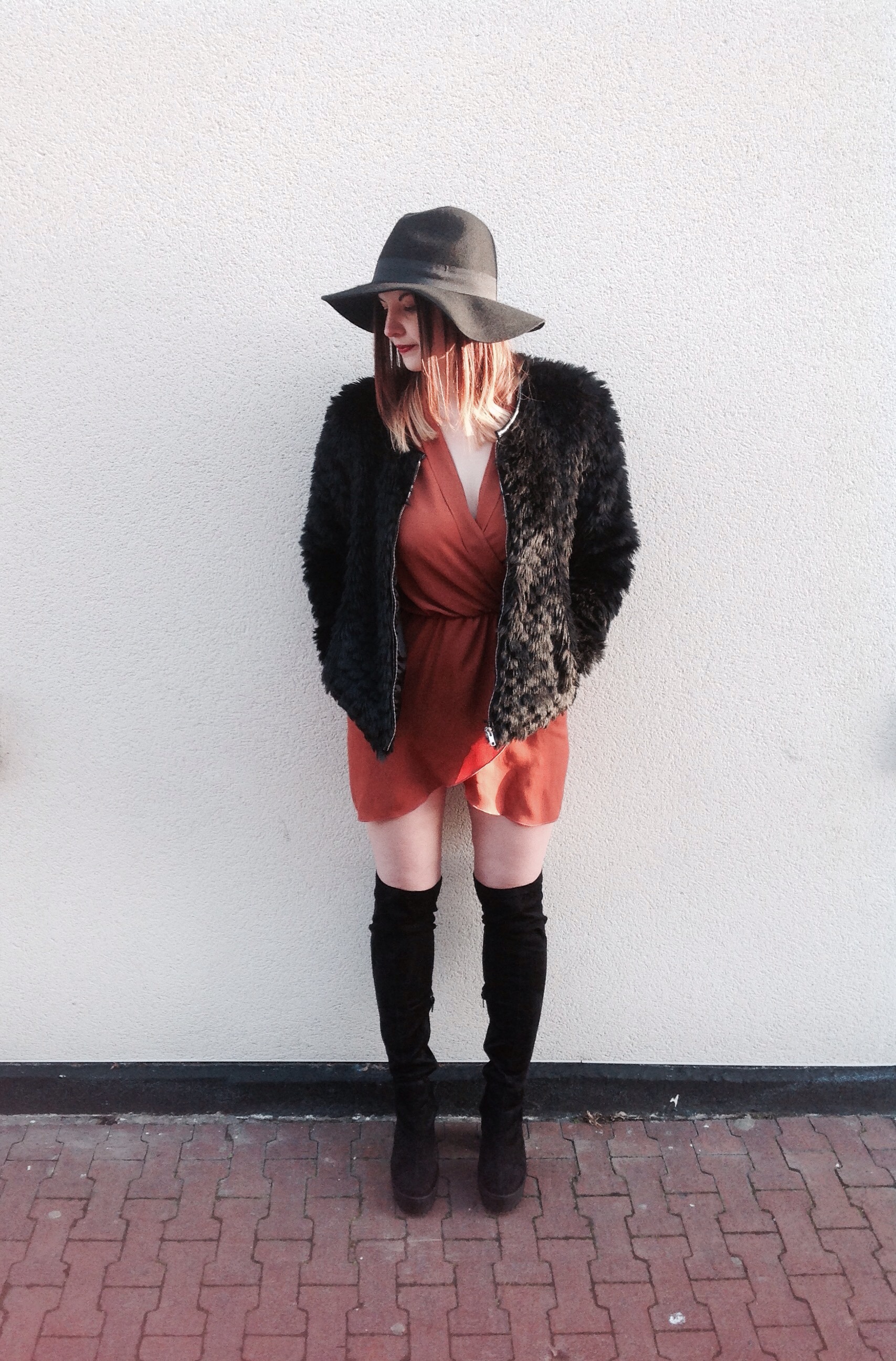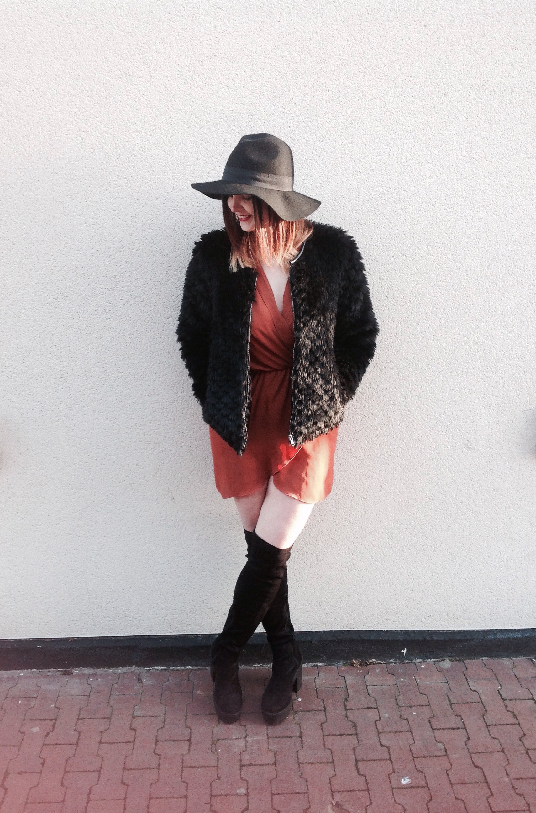 The material of this colour is a little different from my purple number, but still a bit static-ey so make sure you give it a cheeky wash before you wear it (tip- if you hang it straight up afterwards you probably won’t need to iron it). Unlike my Fresh Princess look last week, I meant to have my furry jacket on in these shots, I do enjoy a bit of fluffy clothing! I think it may be an official FBlogger requirement actually…..hehe. I kind of like the lil 70s vibe of the whole look – yeah baby! Actually that may be the 60s, whoops!
