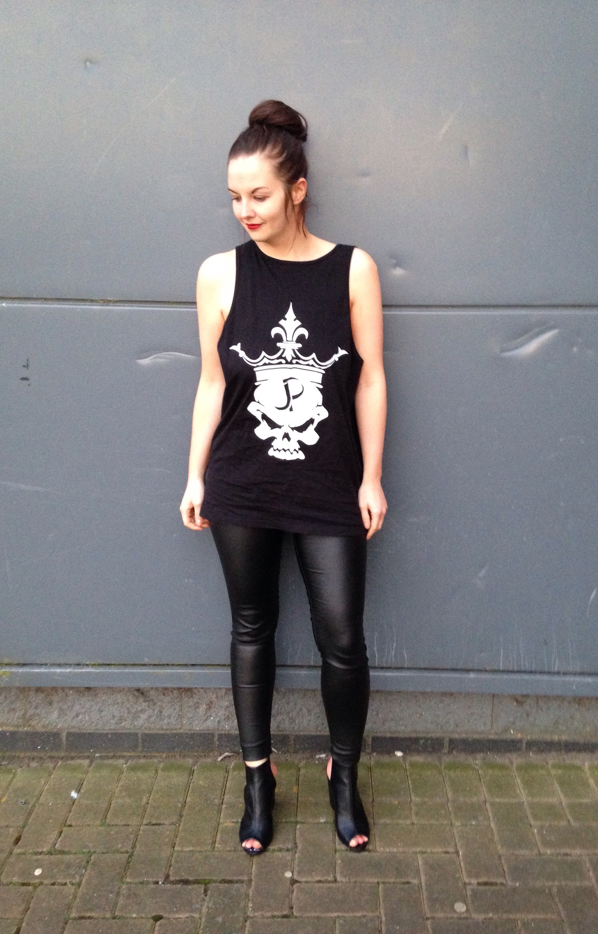 I sized up to a large in the vest so I had that oversized thang going on (and also worked really well for keeping me cool). I was contemplating wearing a coloured bra to add some POW to the underarm gaps but I opted for a black bandeau in the end to keep it completely black. By the way – I’m actually wearing the vest backwards as the skull should be at the back, but this design is available on a front or back design and in other colours too (I kind of like the higher neck/drop back line I got from doing this as well).