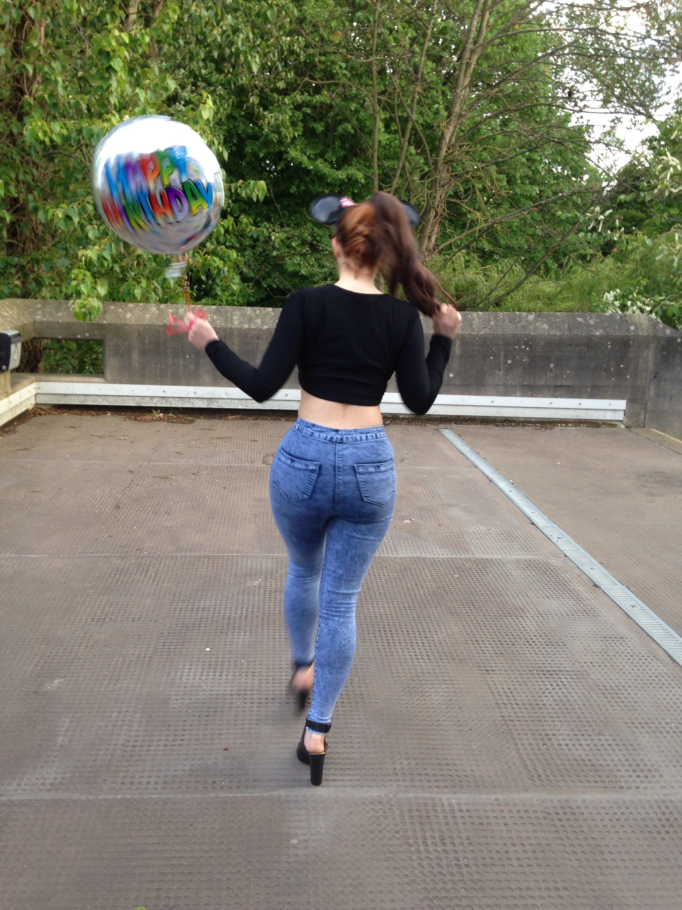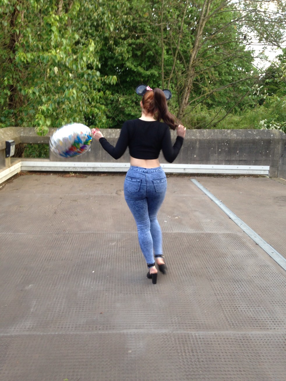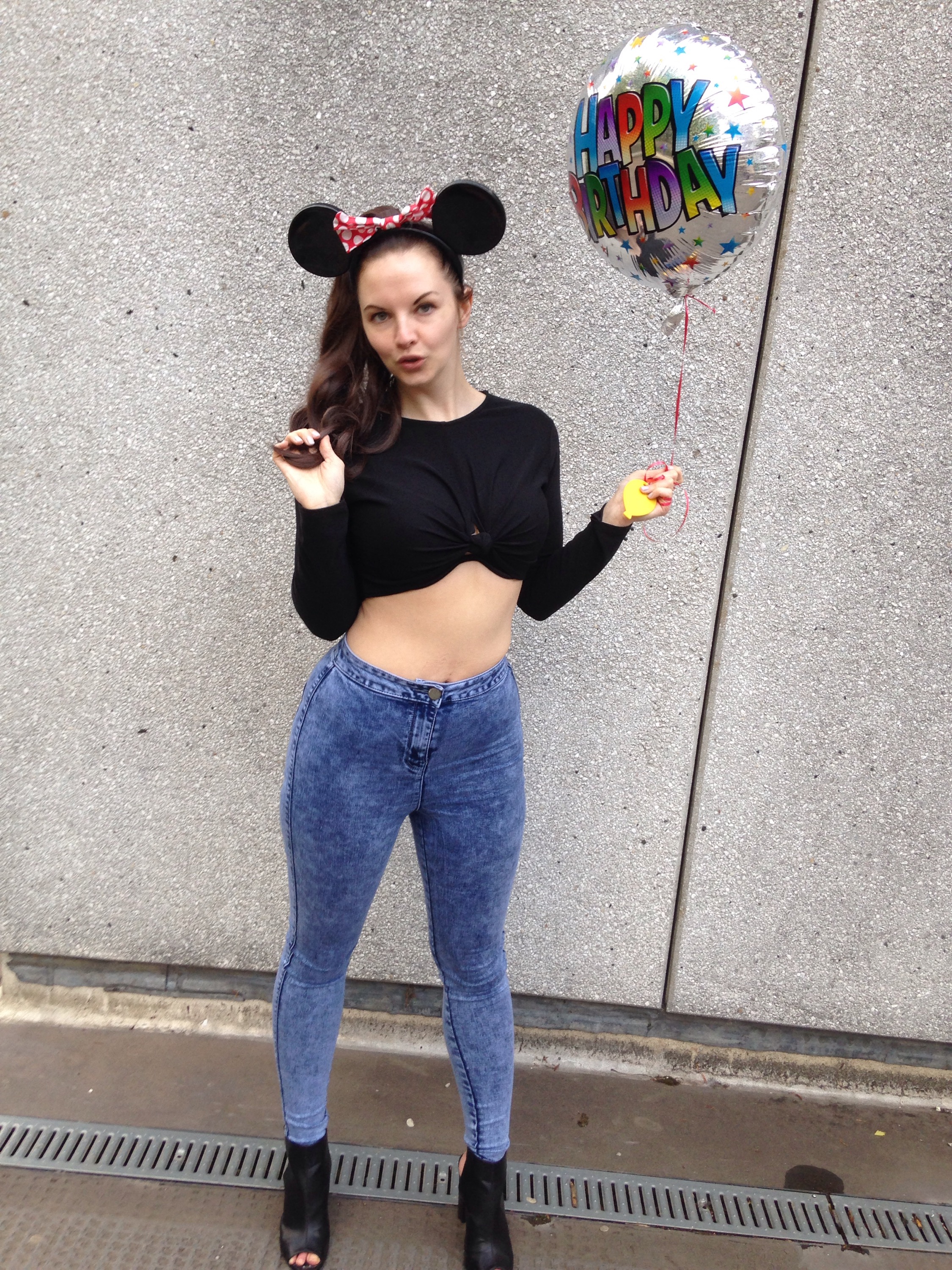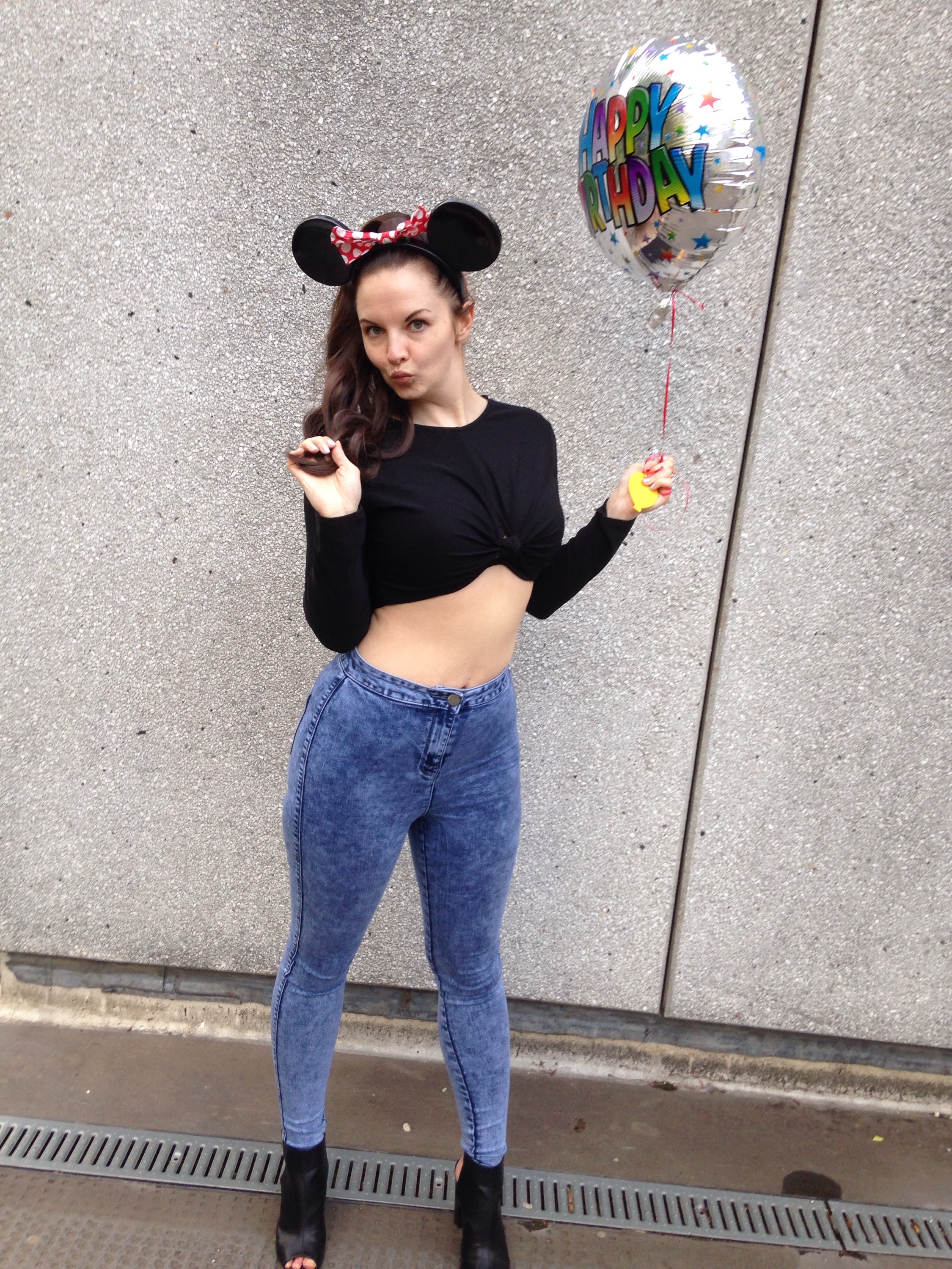 Top- Miss Foxy, Jeans- Matalan,  Shoes- Public Desire, Sunglasses- A Turkish sunglasses shop (they say Tom Ford on them, I have my doubts…), Mouse Ears- Disneyland Anaheim, circa 1988, Ponytail- Hair Rehab London