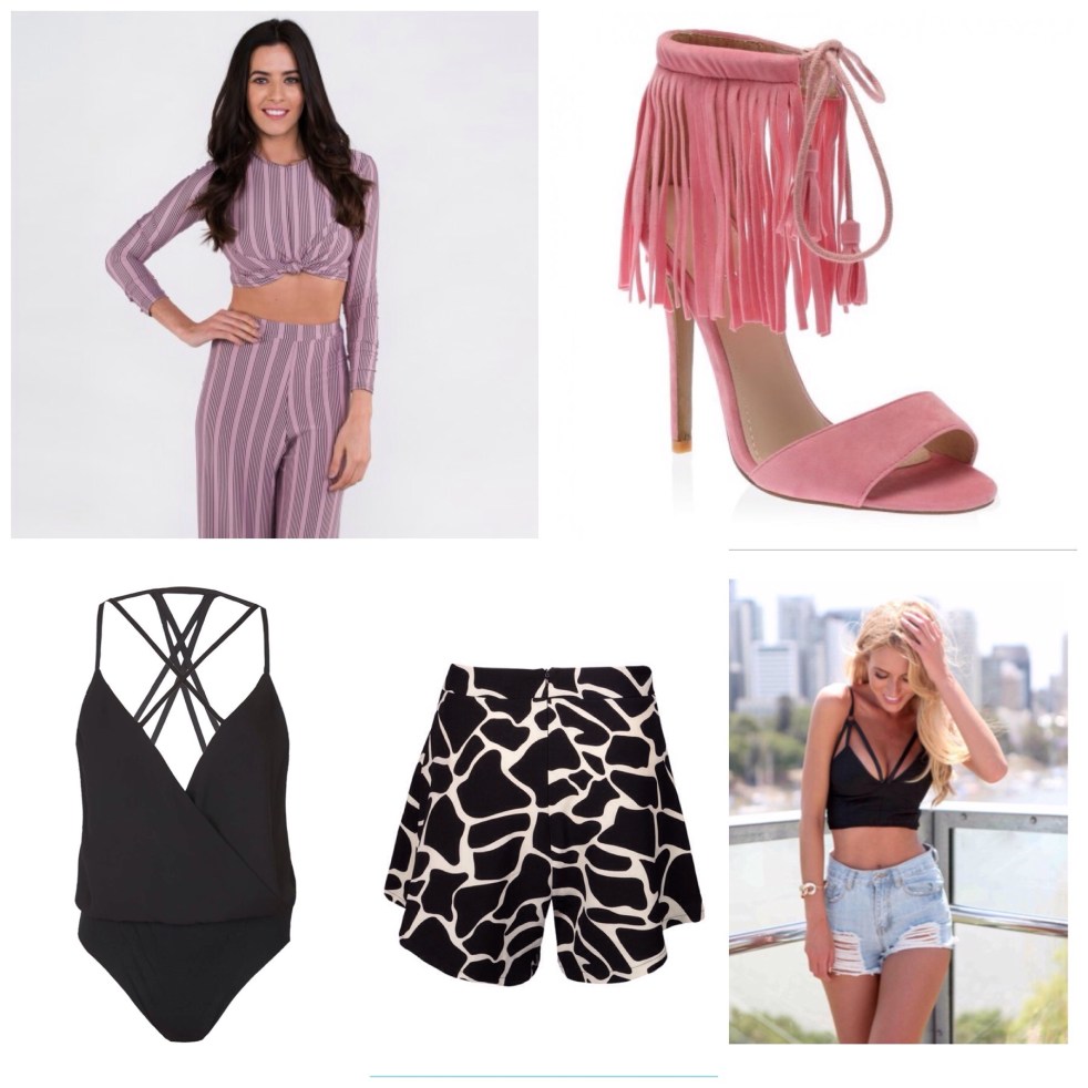 Missy Empire Shona Dusty Pink Coord/ Public Desire Jennie Fringe Heels/ Glamorous at Top Shop Crossover Cami Bodysuit/ Nostalgia by In The Style Giraffe Print Shorts/ Cherry Diva Black Harness Bralet