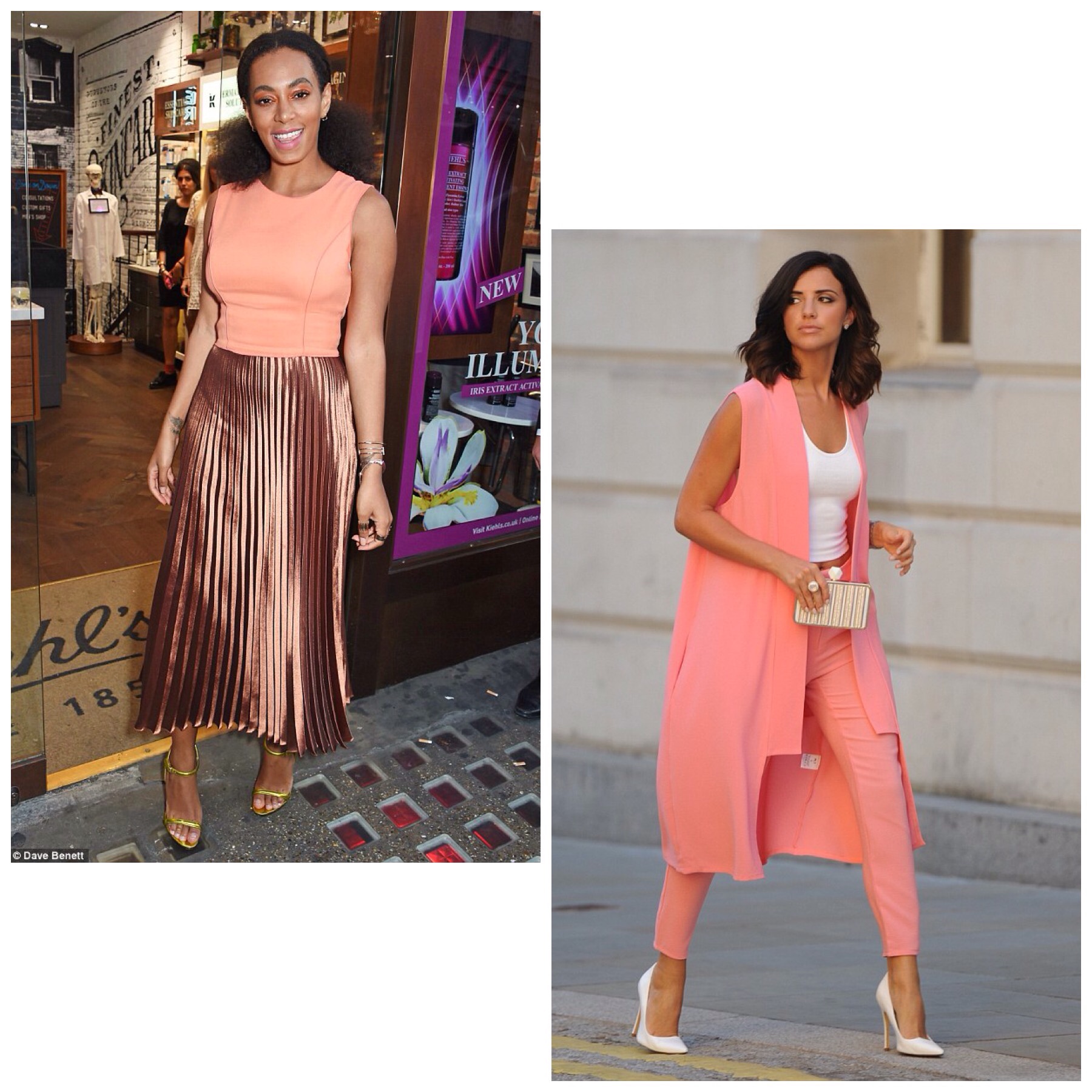 I almost fell off my chair taking in Solange’s look, it just seems so…well normal! I often appreciate her style but I’m attracted to this look because it feels very Parisian chic (which I believe is where she was) yet still very Solange with the eye catching metallics and clashed up strappy sandals. Tres Bien Madam Knowles! Even though it’s orange this Pretty Little Thing dress is a really similar style in just once piece, it’ll be really flattering when the skirt flares as you walk too.