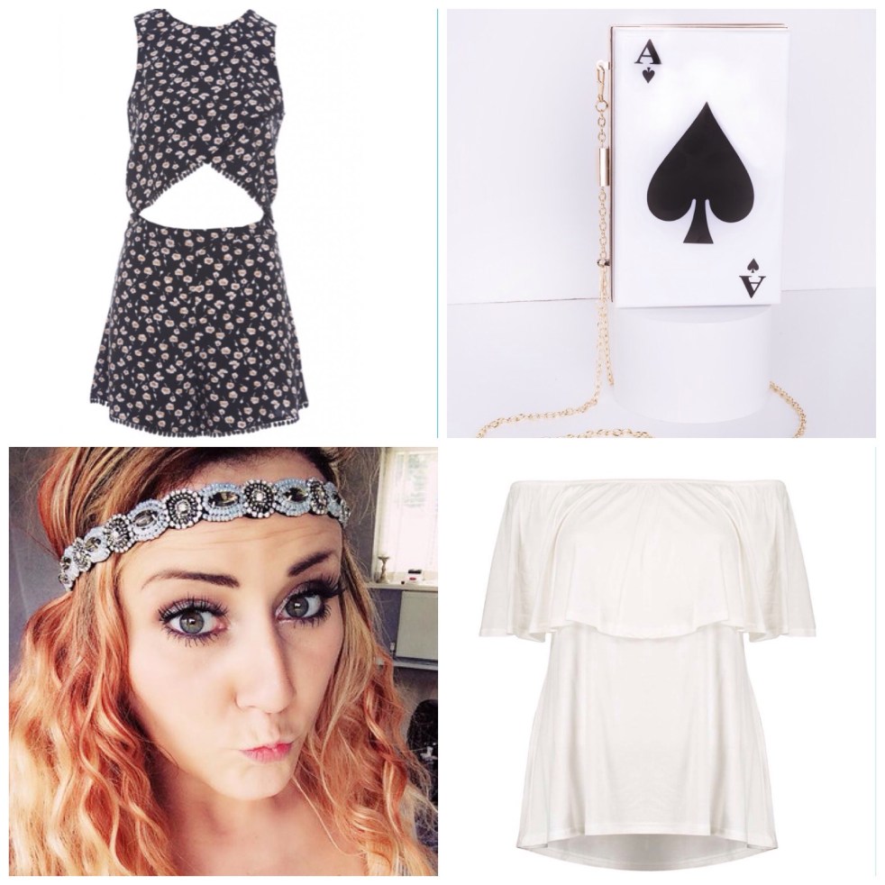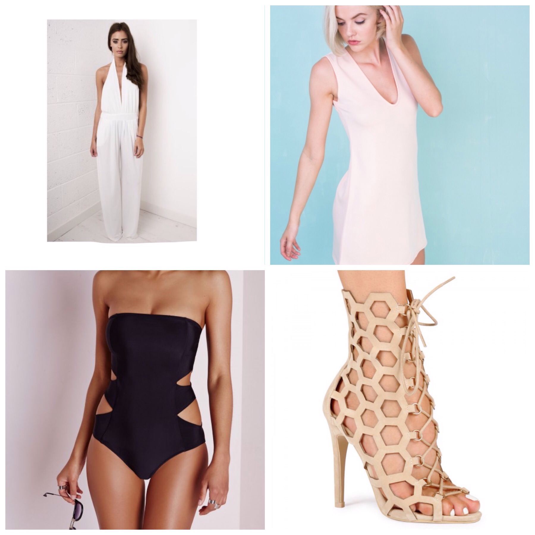Black Floral Coord AX Paris/ House of Cards Box Clutch LA Sula/ Rinestone Headband Cherry Diva/ White Bardot Top Boohoo/ Backless White Jumpsuit Miss Foxy/ Nude V Front Shift Dress Missy Empire/ Cut Out Swimsuit Missguided/ Beige Cage Lace Ups Ego