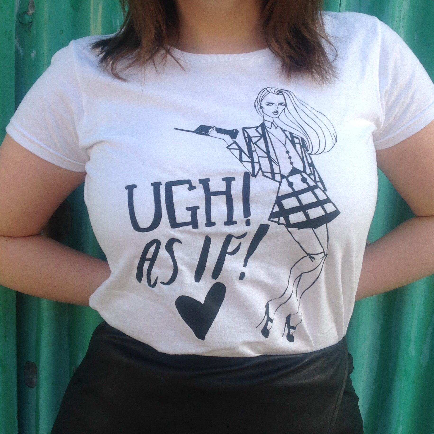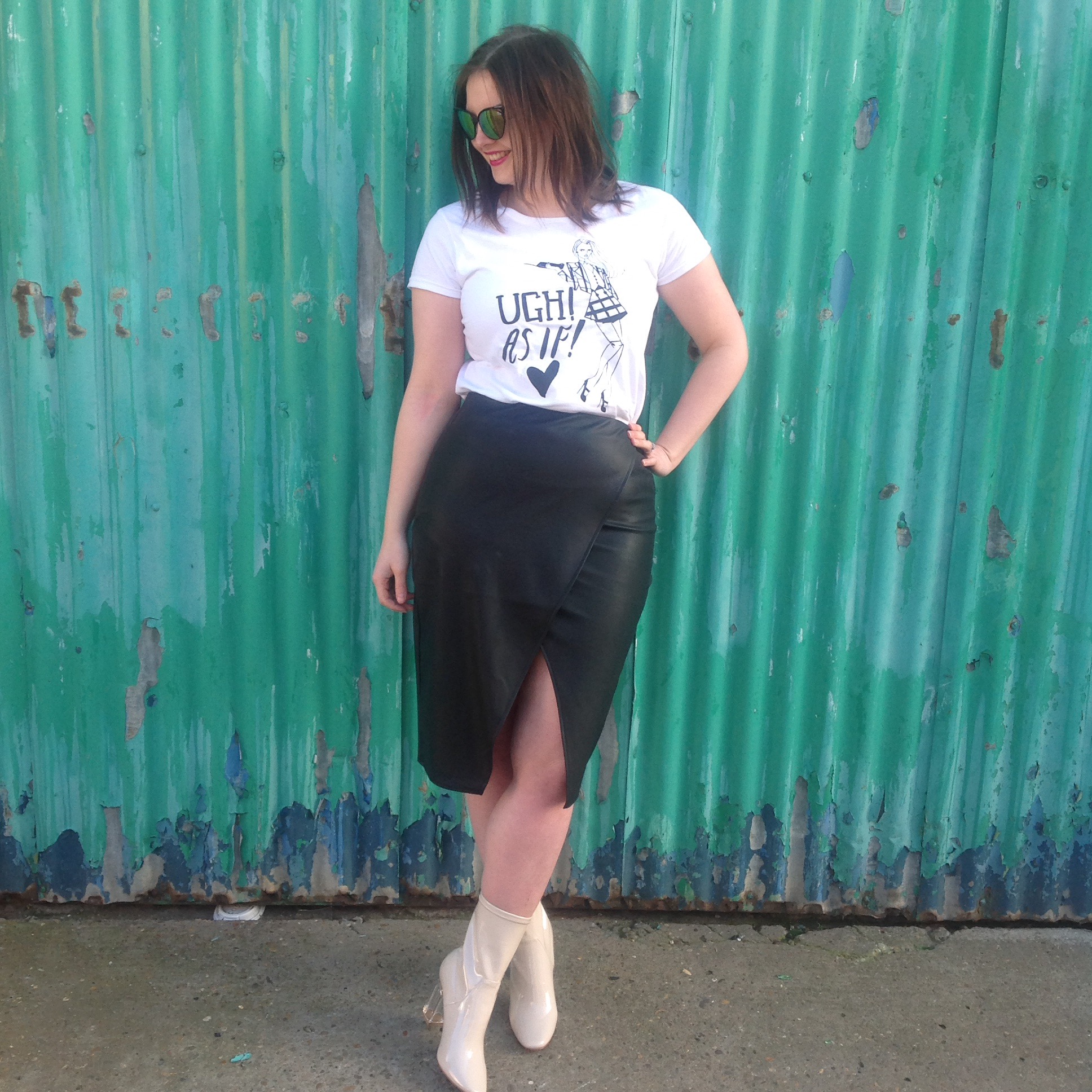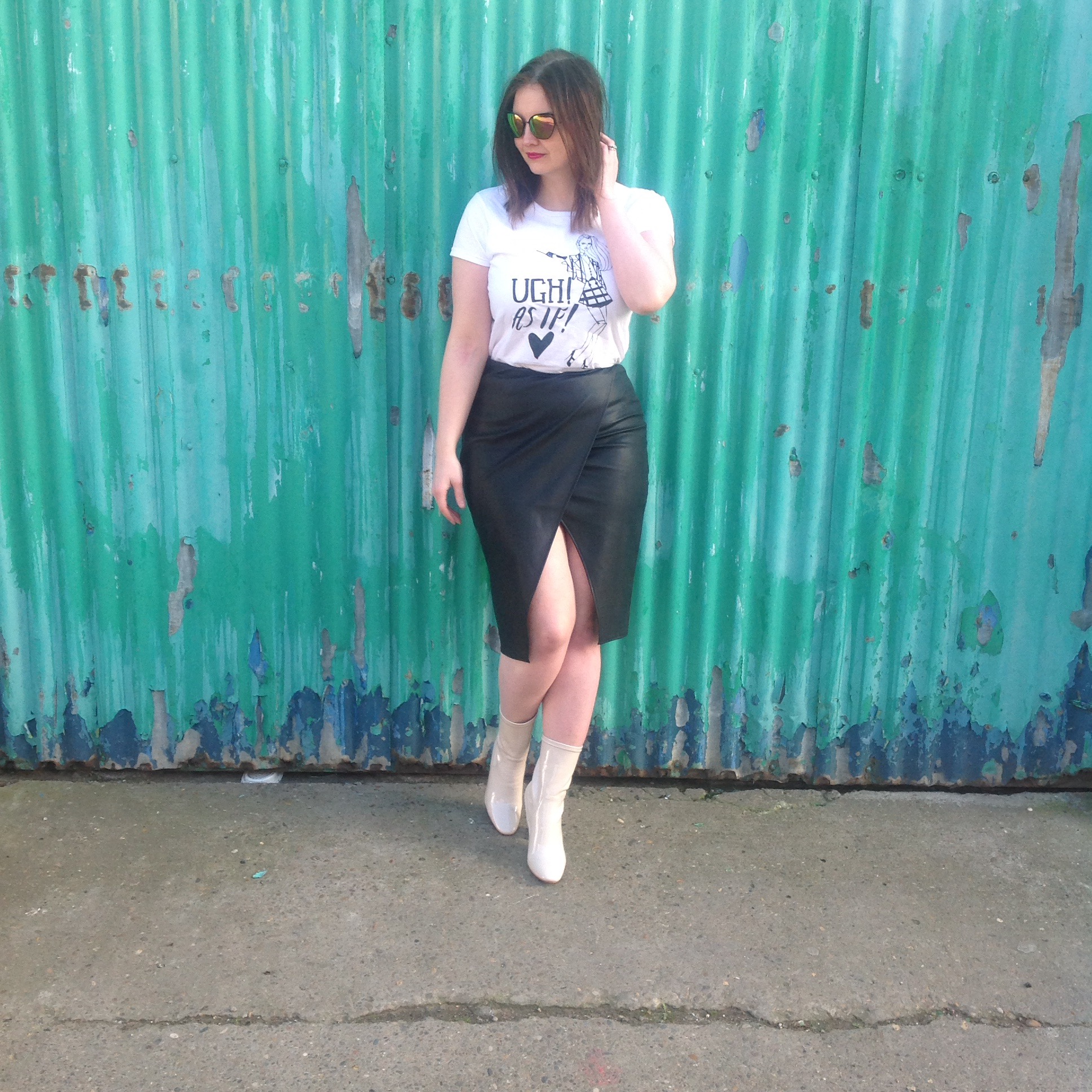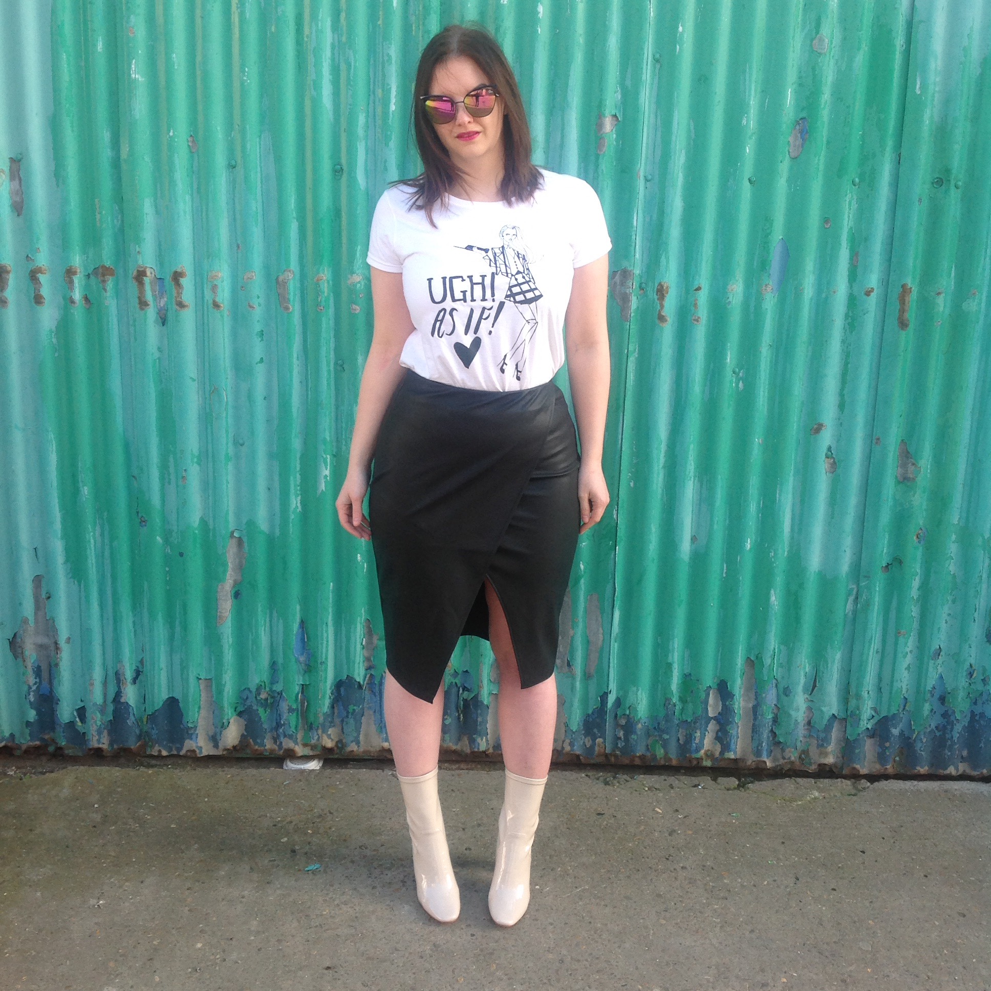 I really like the vibe of taking a super sexy material like leather (or pleather, in this case) and cas-ing it down a bit with a cool tee . The problem is that I don’t usually get both of things in my wardrobe at the same time…not any more! Big shout out to Dom, the designer of my awesome Clueless tee – when he launched this collection he asked his Instagram followers what other designs we would like to see, I said Clueless…days later he had sketched out this beauty. I realised after these pics were taken that my skirt wasn’t in the right place- it should be high waisted and look a bit more flattering than this! And FYI: my bitch face is also back a little bit…