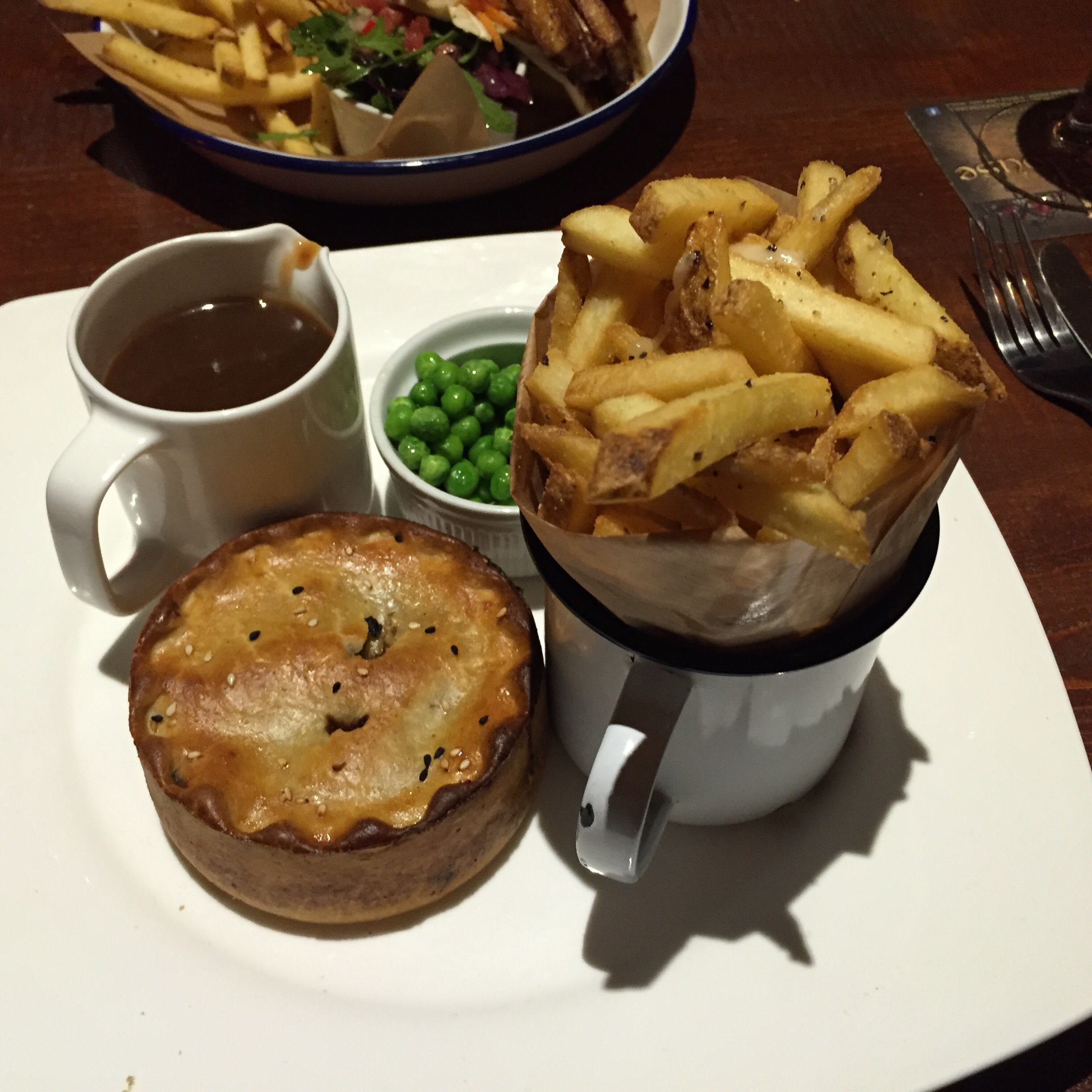 Wagyu beef pie with garden peas, gravy and Parmesan truffle fries