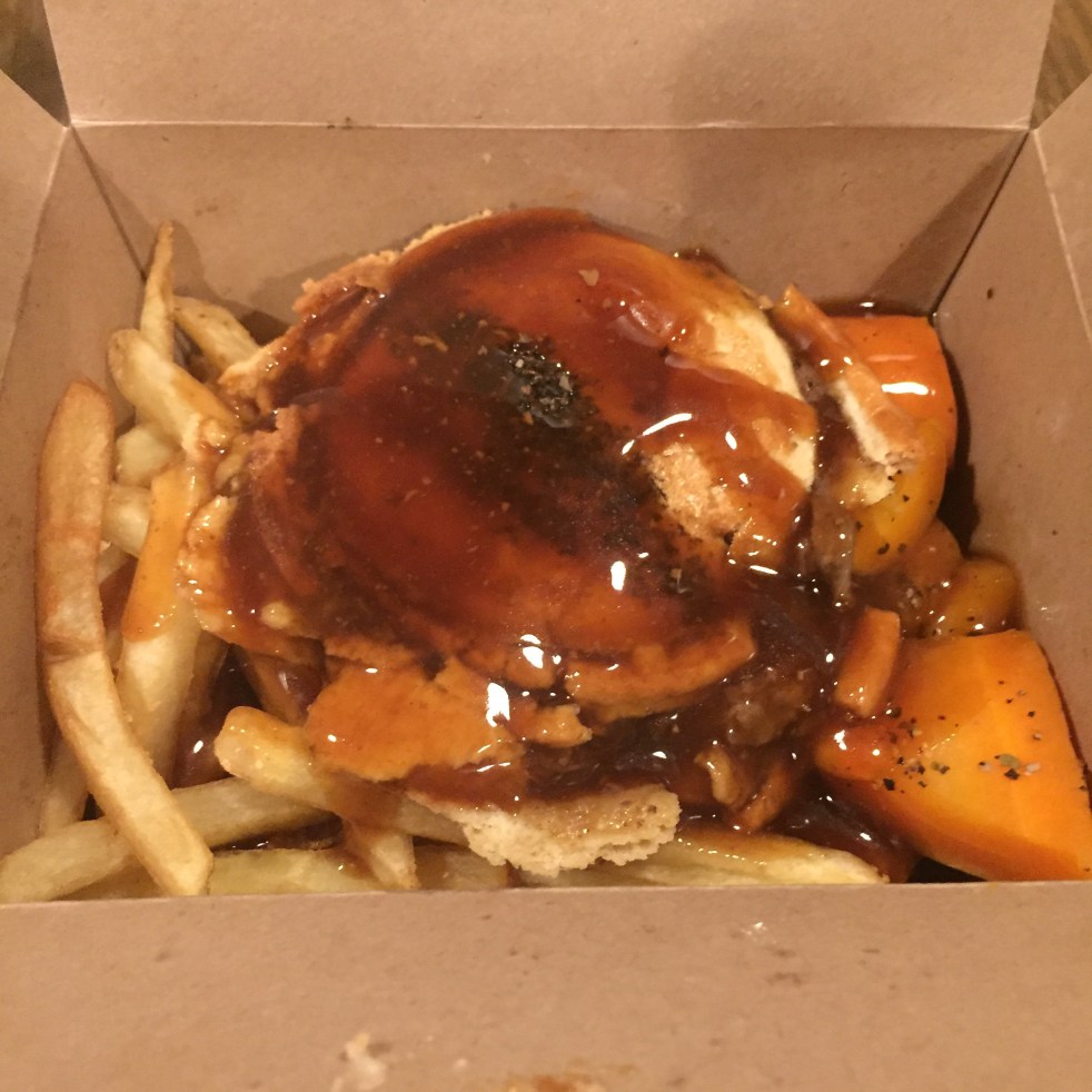 I maintain that it’s difficult to get a decent shot of a pie inside a little box covered on gravy, but I’m sure someone out there can prove me wrong!)