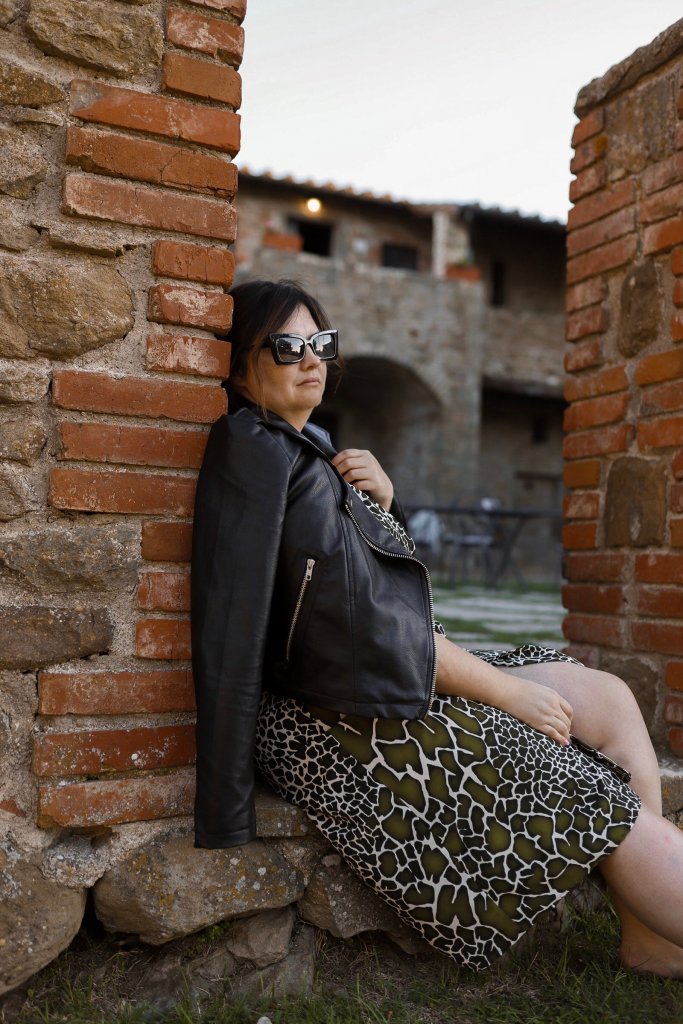 This is what I’m calling my “I’ve partied hard, but only ’til 10pm” look. As soon as I saw the bold print of this shirt dress I knew it had to be mine, and in a bizarre twist my nan also picked up a pair of wide leg trousers in the very same print on a recent shopping trip…great style runs in our family it seems! I’d definitely suggest sizing up one or two in this frock if you have bigger boobs as the fabric doesn’t have any give, it easily clinches back in with the attached belt so the shape isn’t lost. The biker jacket was necessary for the chill or early mornings and evening, and made me feel a bit more cool and Italian.
