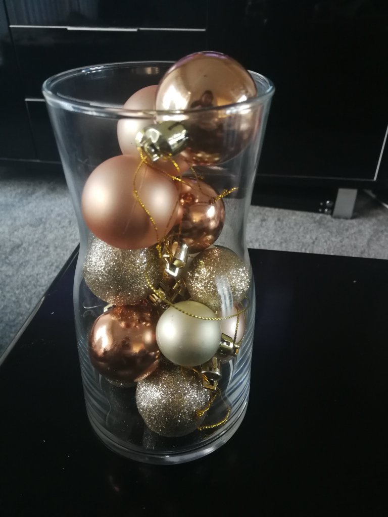 Taking vases I bought from IKEA a few weeks ago, I simply kept some of the smaller baubles out and filled each case to the top.