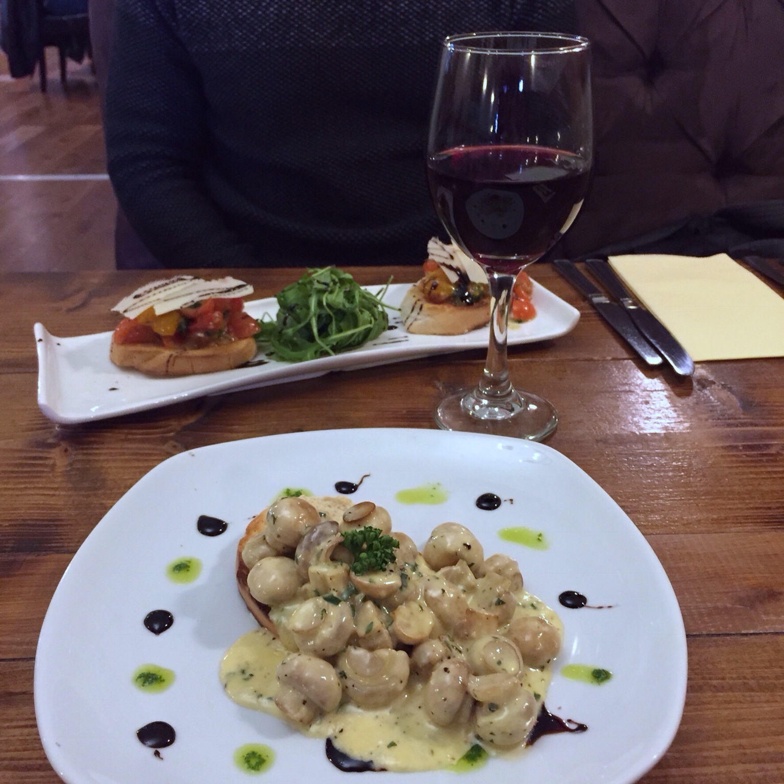 To accompany my glass of vino (upgraded from a small to medium as it was only 50p more, I’m such a sucker for an upgrade) I started with garlic mushrooms on sourdough toast – super flavoursome, tasty and not too filling before the main event. The Mr had wonderfully fresh and delicious bruschetta.