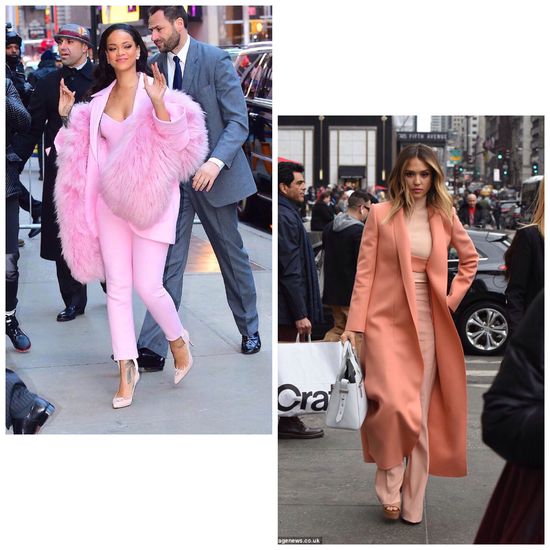 I’m just gonna go ahead and say it – if wearing head to toe bubblegum pink (complete with fluff) is wrong, then I don’t wanna be right! Slay it RiRi gurl…. Jessica looks so chic I can’t event cope – but I can tell you that Missguided have a great selection of pink jackets in similar shades to both that’ll look just as hot on U.S. mere mortals if you click Here