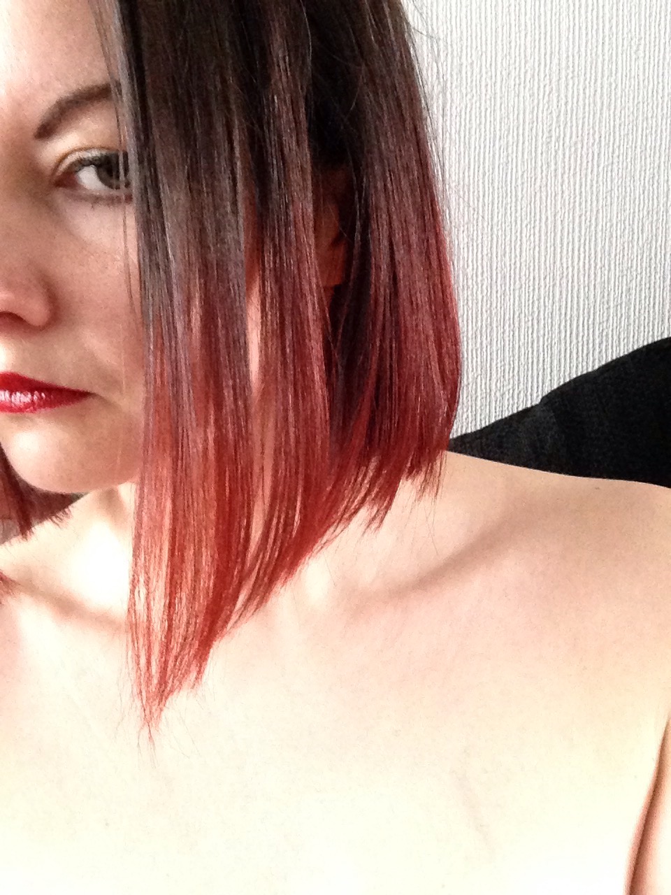 I’ve used this Superdrug own brand colour for years (even before my broke ass student days) it’s great value and the colour is a perfect match to my natural colour. I used the Loreal Wild Ombre for my previous blonde, and seeing the new red shade made me feel a bit naughty and impulsive! Little hint- even if you’re a home dye pro I’d get help applying this and have an old sheet/massive old towel, you need that second pair of eyes to watch for the colour dripping on your skin and over the surfaces (I say this with red fingernails/neck and a now dodgy looking stain on my bathroom floor!). I applied them on the same day, one after the other. I kept the brown to just where the darker part of my hair is in phase 1 so that I wasn’t overwhelming my hair with extra colour when applying the red.